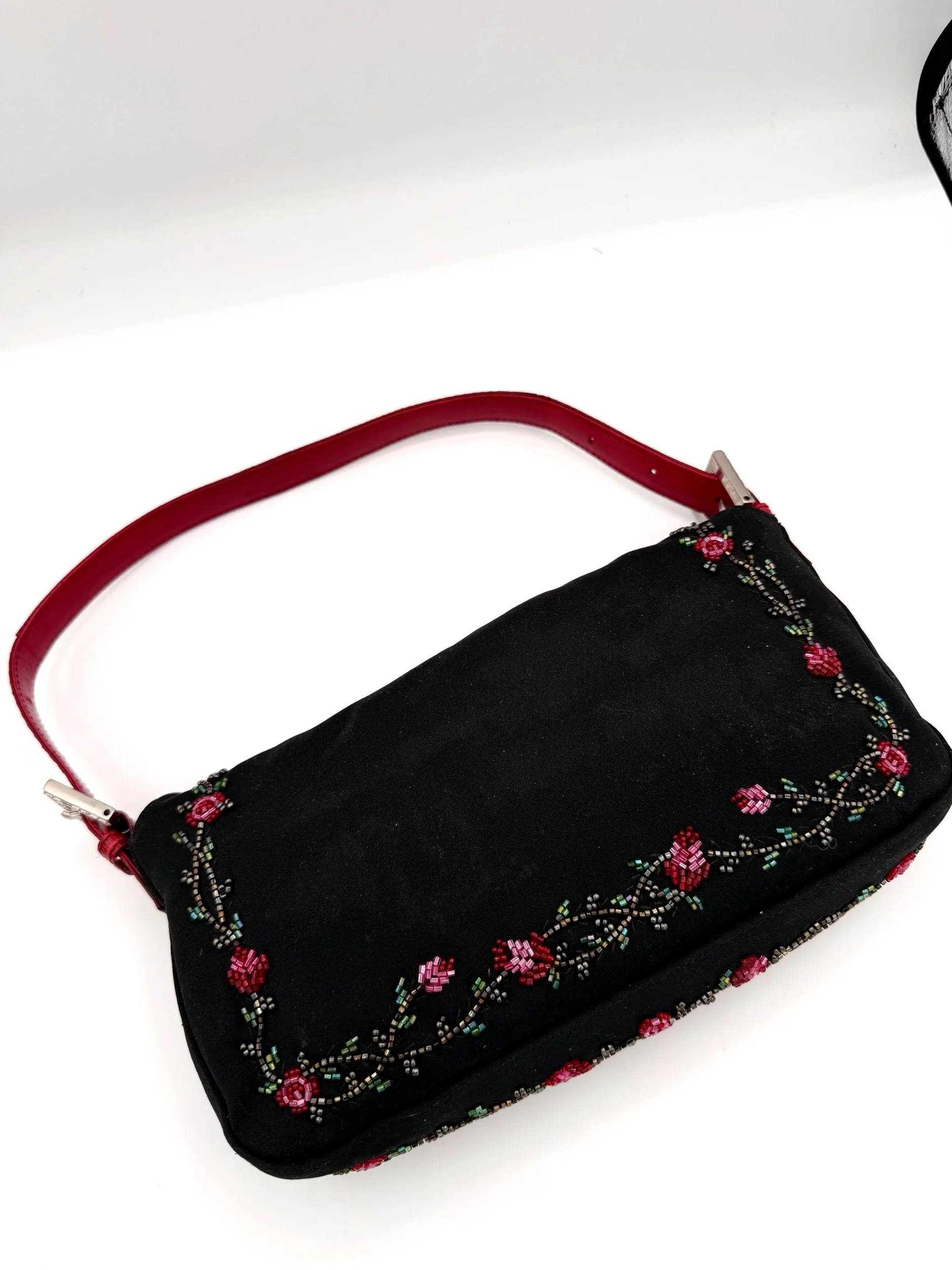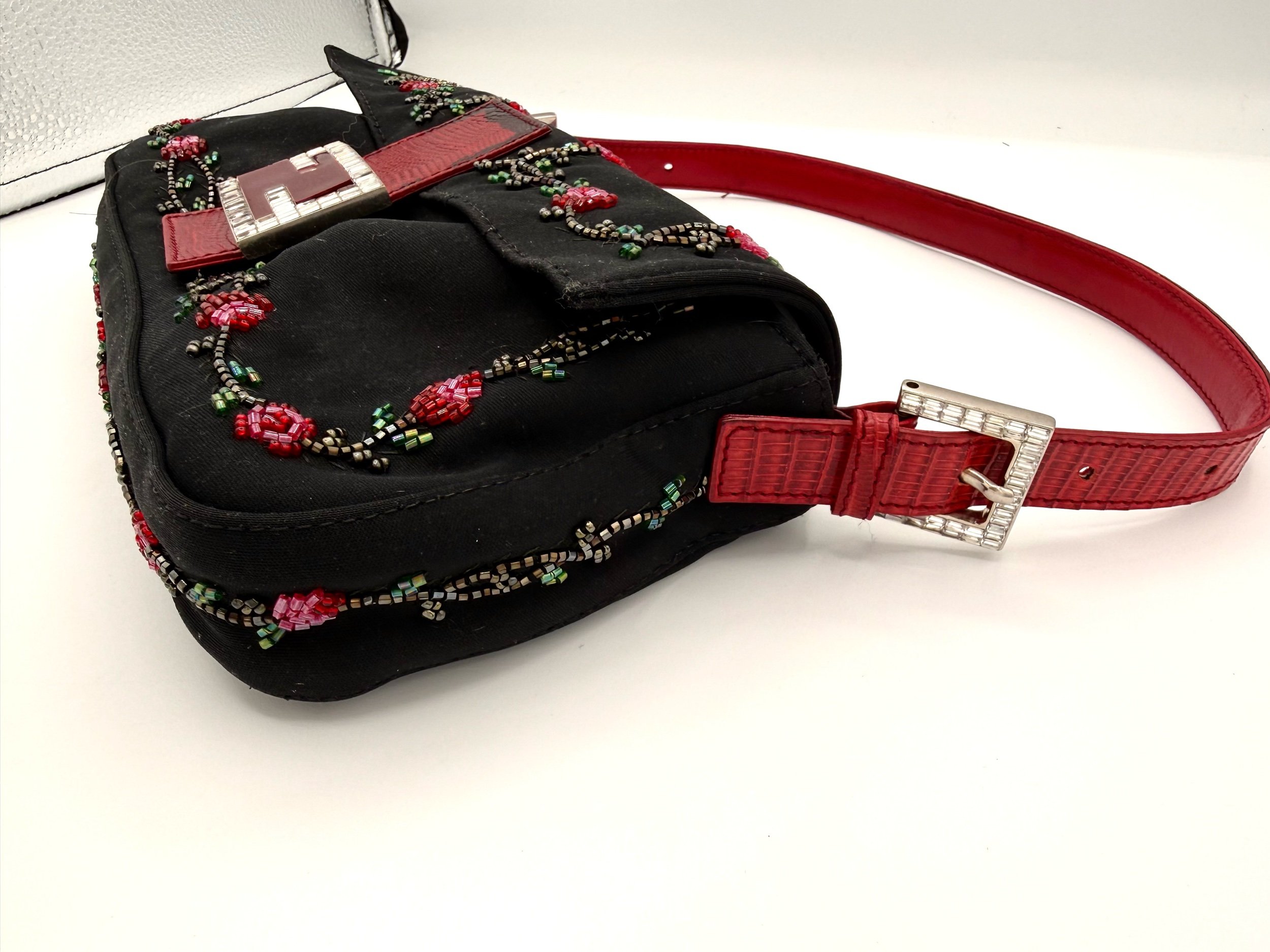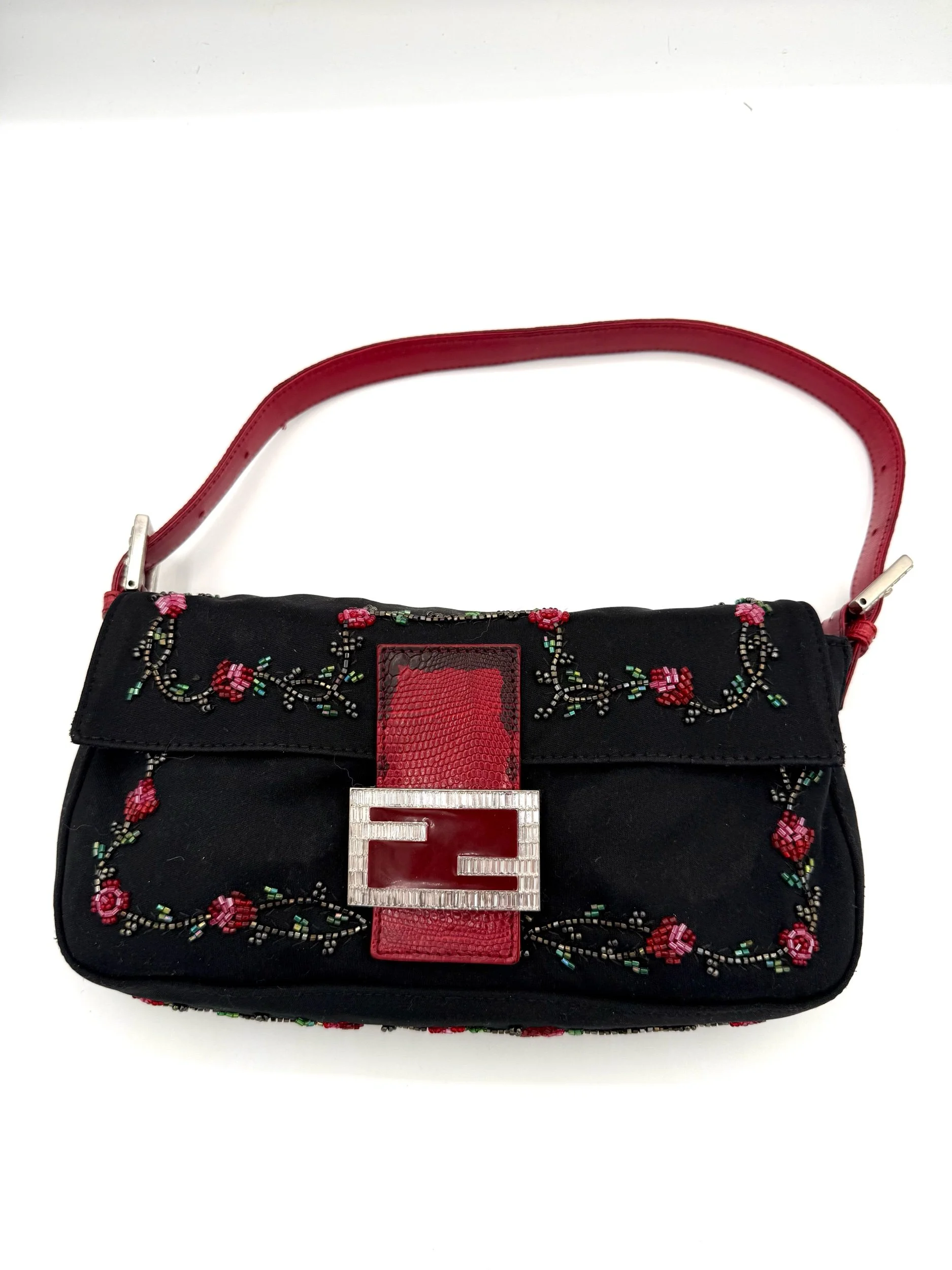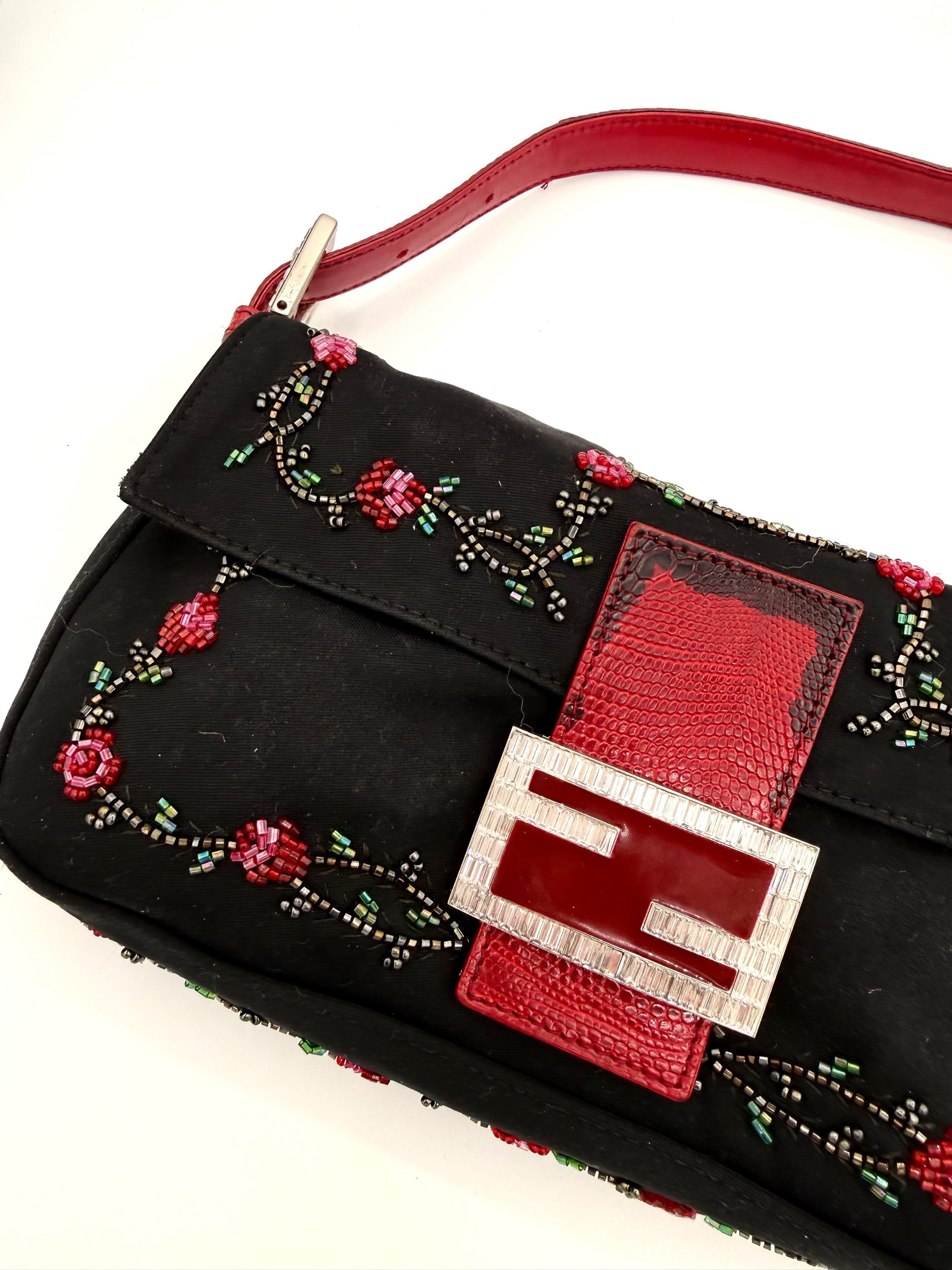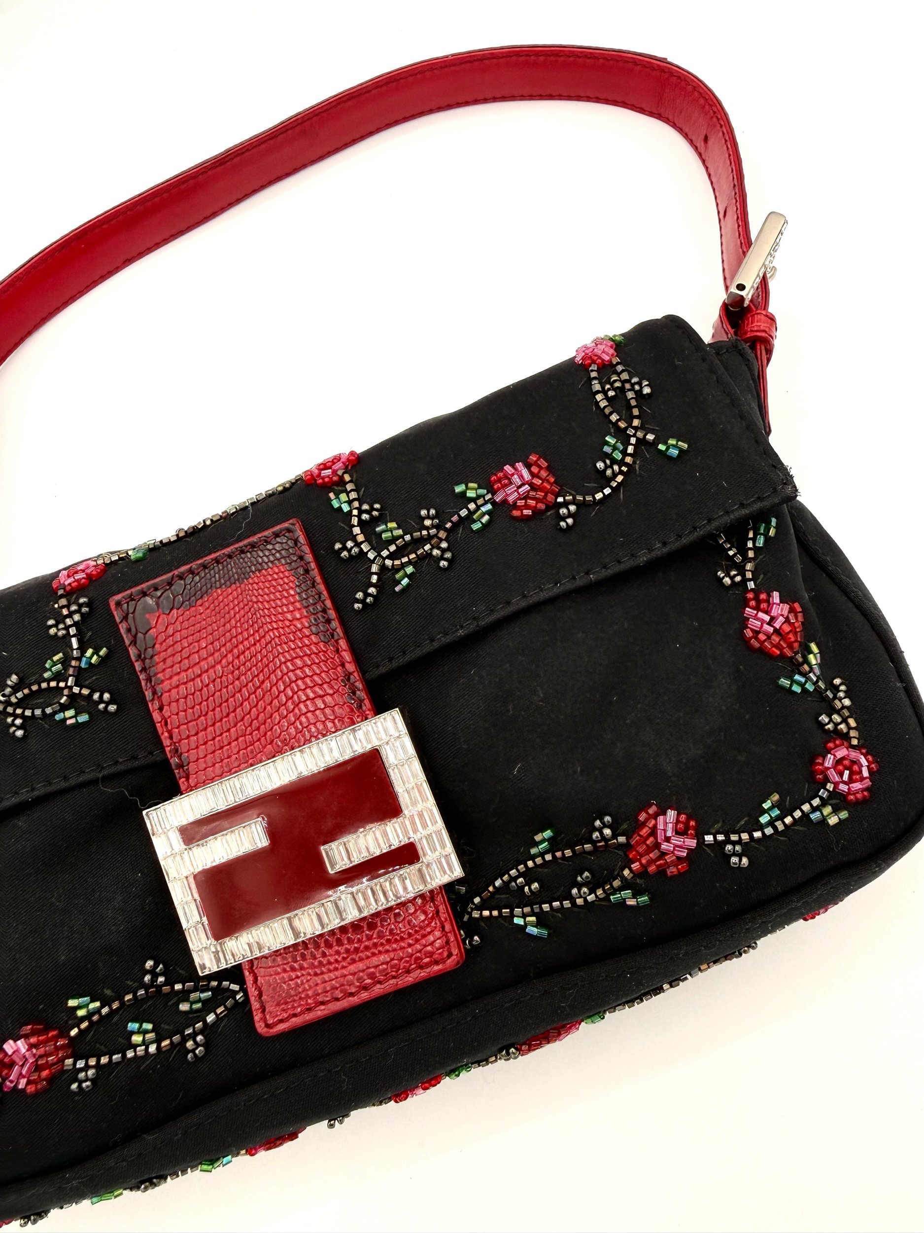 A really special Fendi Baguette. This piece features a black neoprene body detailed with intricate red floral beadwork, finished with rich red lizard trim and a crystal embellished FF clasp at the front. The contrast of the soft neoprene with the beadwork and exotic trim gives it that perfect early 2000s Fendi drama. It feels romantic, a little moody, and unmistakably going out.