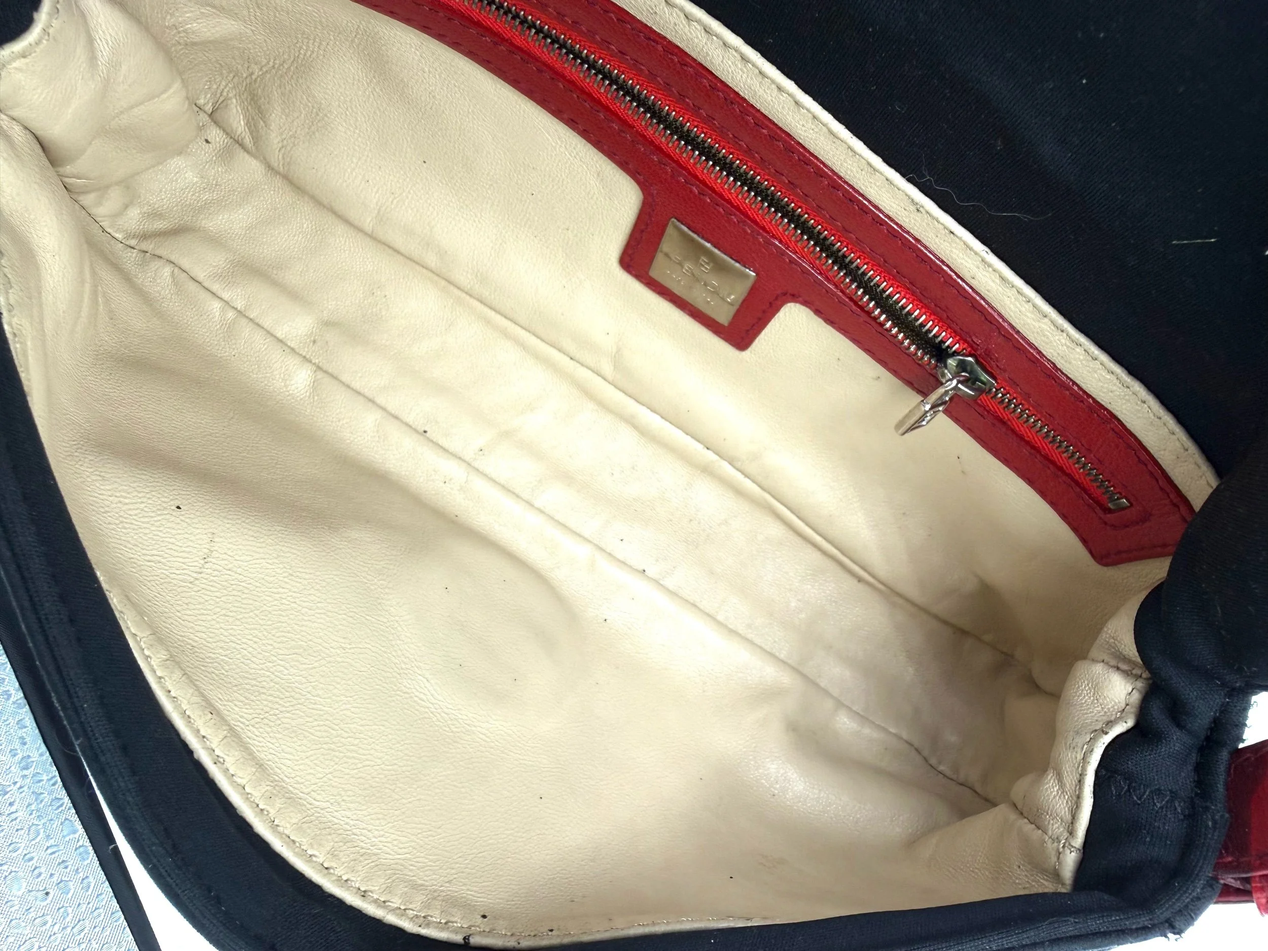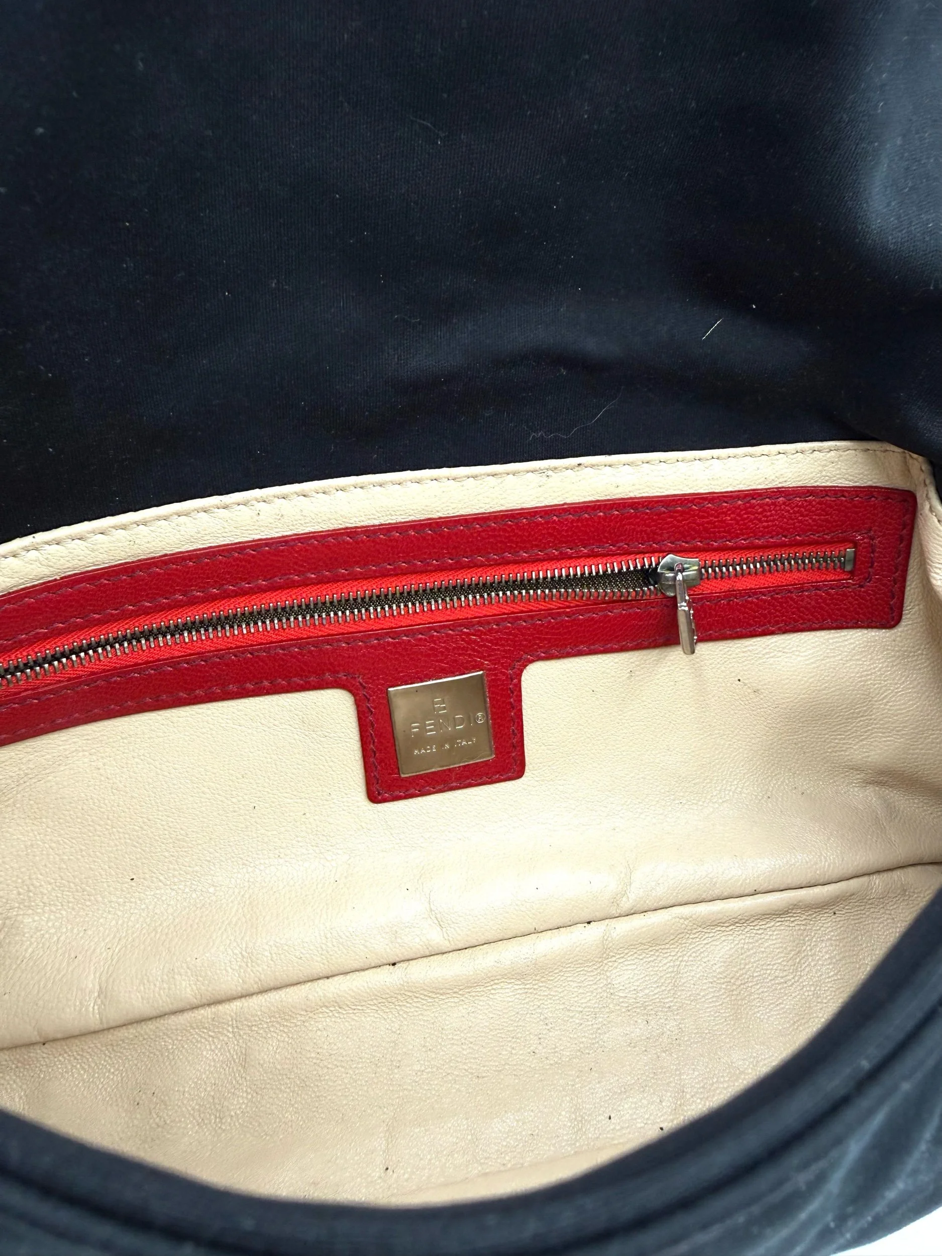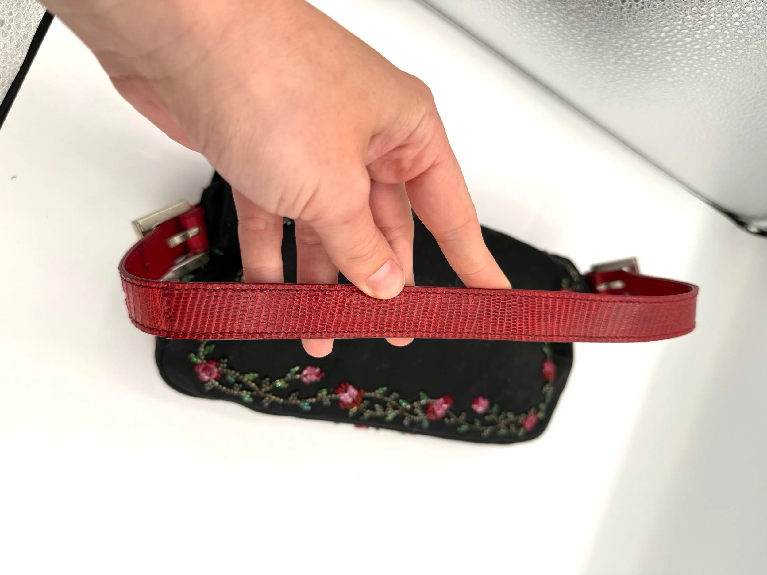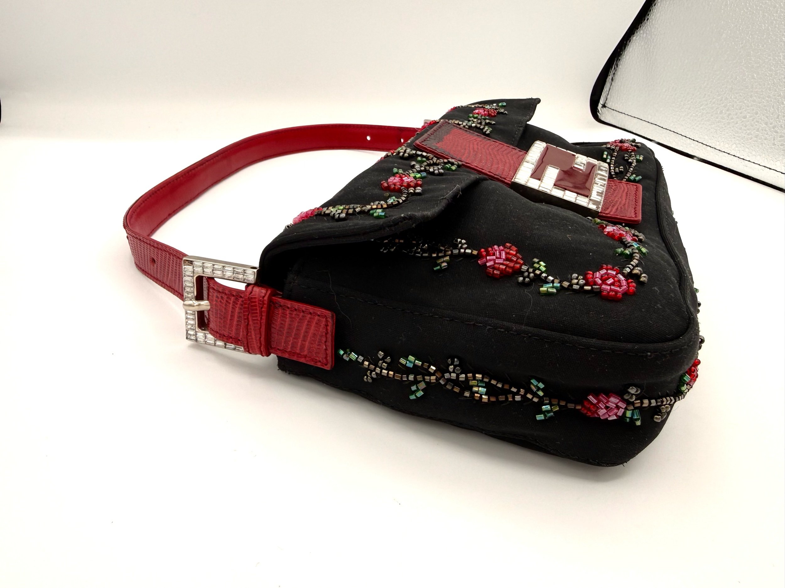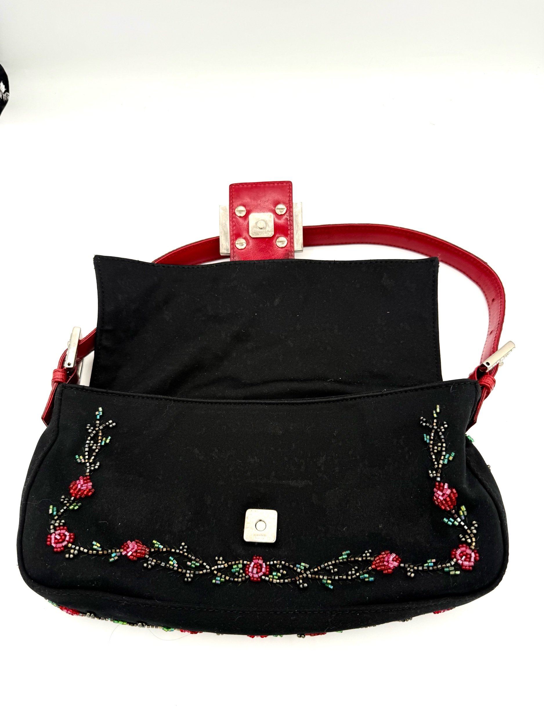 A really special Fendi Baguette. This piece features a black neoprene body detailed with intricate red floral beadwork, finished with rich red lizard trim and a crystal embellished FF clasp at the front. The contrast of the soft neoprene with the beadwork and exotic trim gives it that perfect early 2000s Fendi drama. It feels romantic, a little moody, and unmistakably going out.