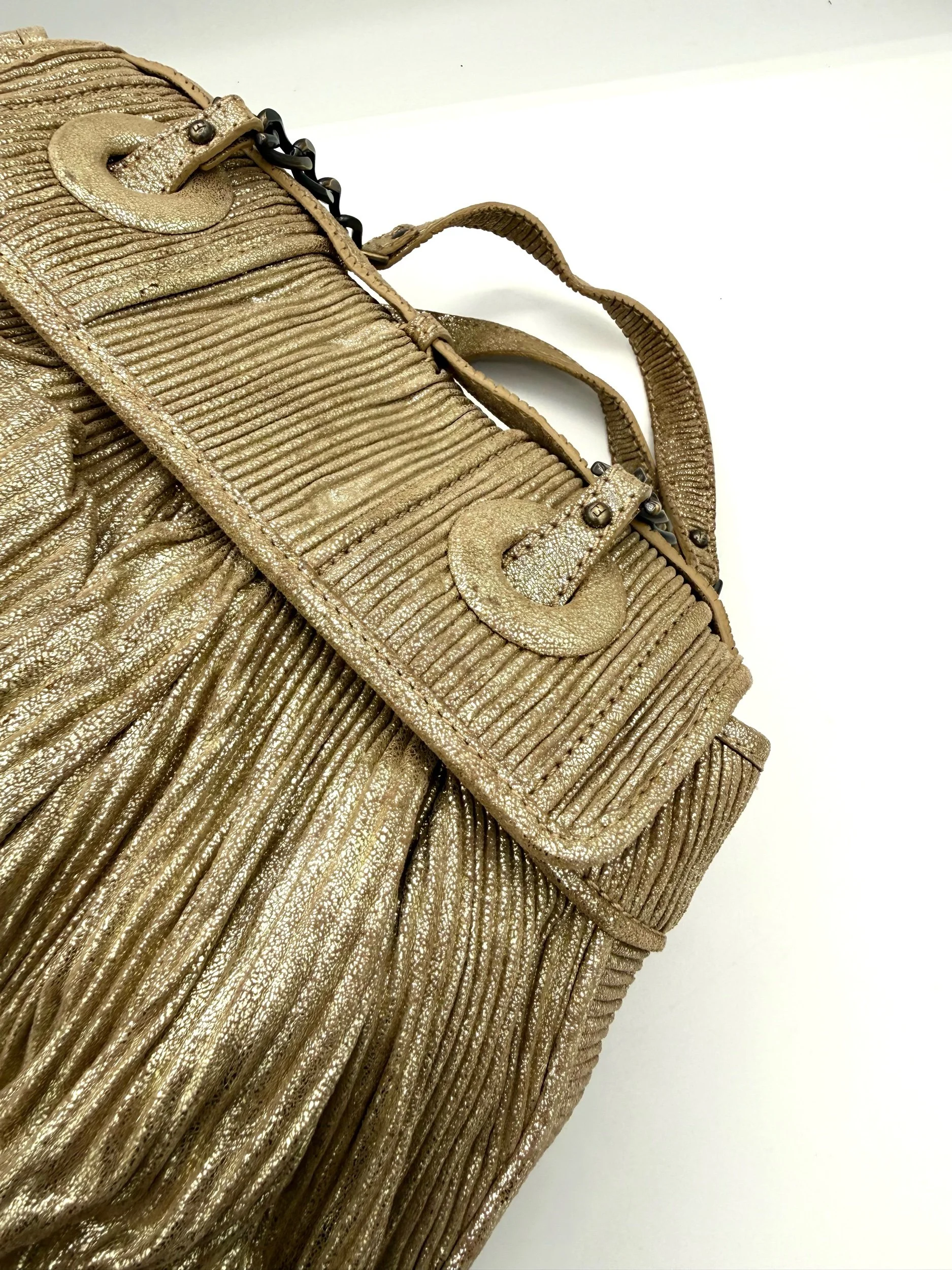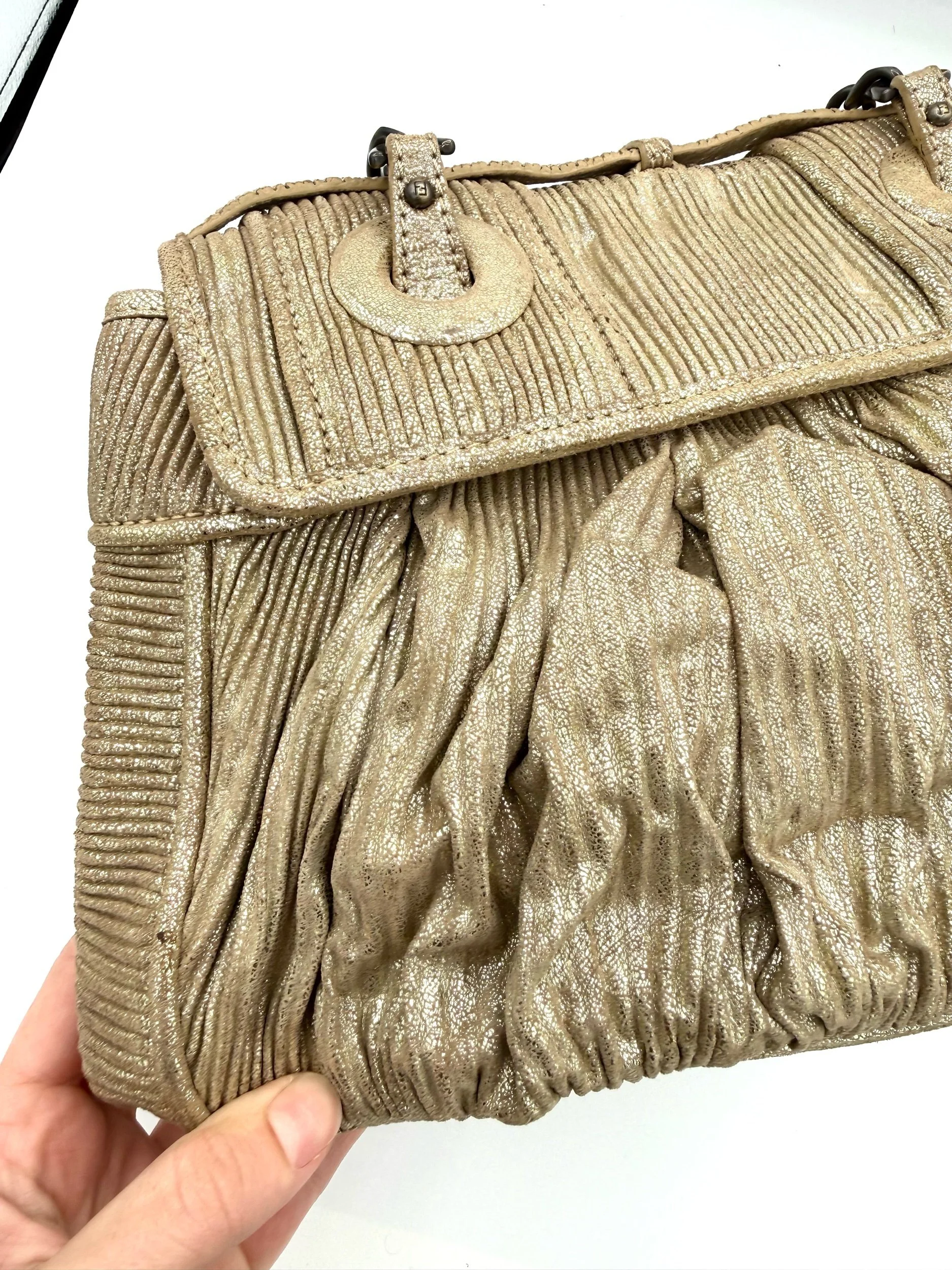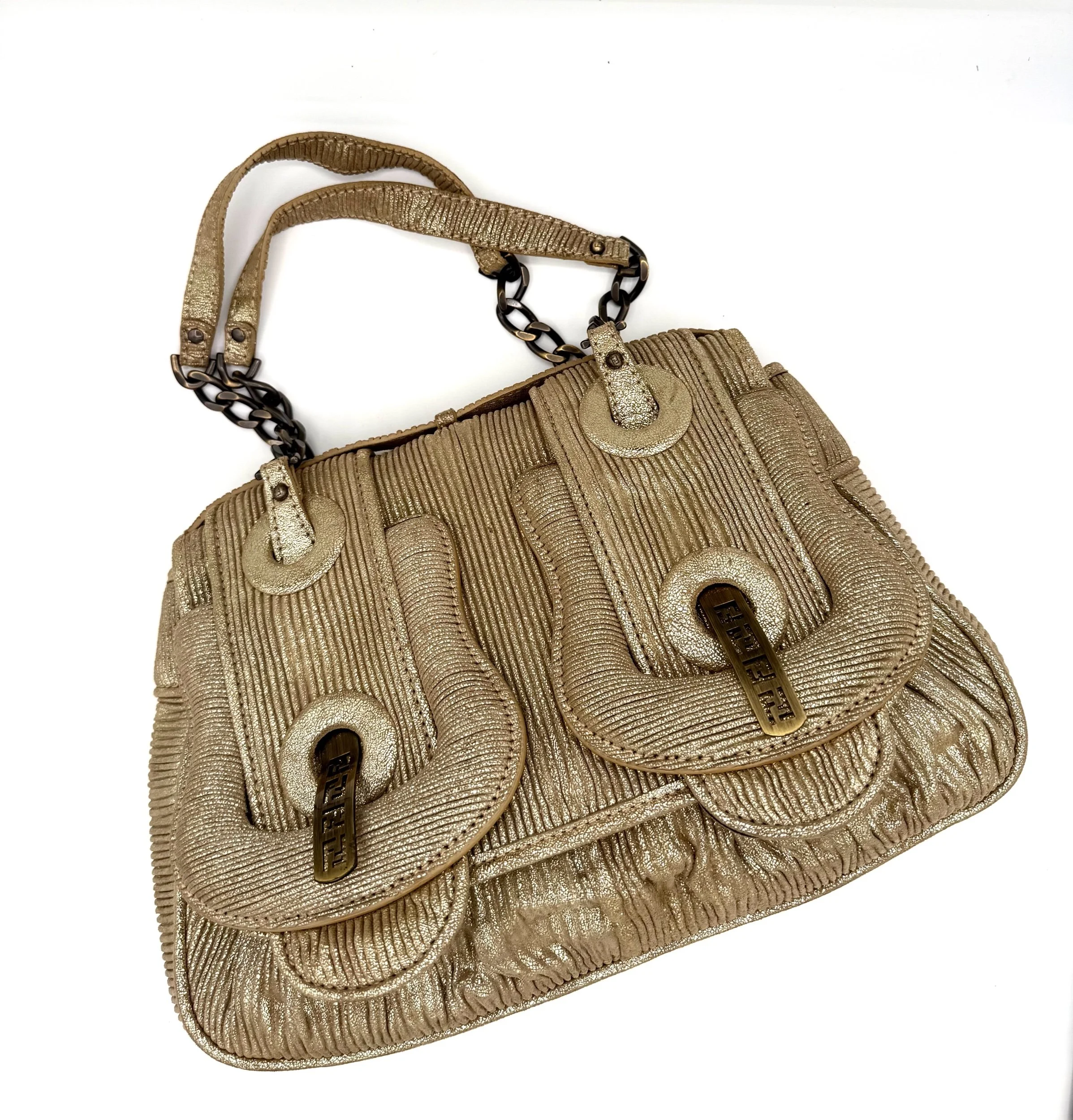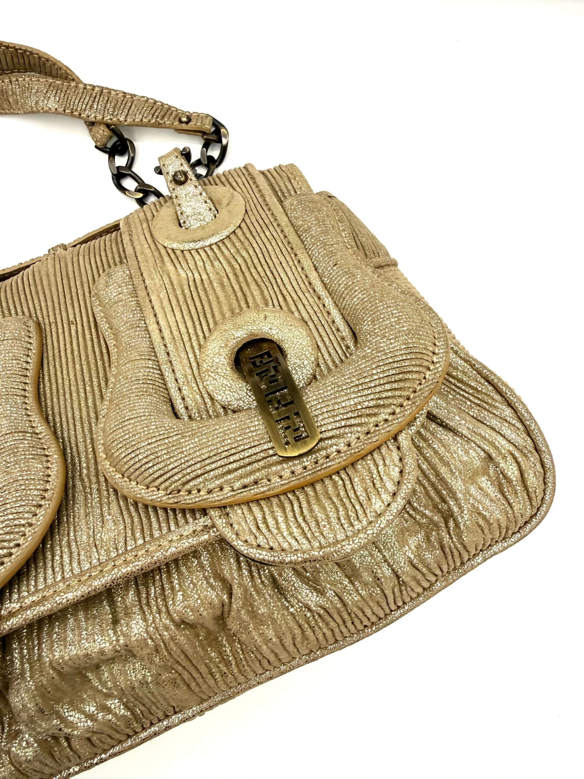 Fendi Shoulder Bag from the 2006 Collection. Crafted in metallic pleated material with gold tone hardware. Features chain link shoulder straps and front flap pockets with logo hardware detailing. Satin lined interior with card slots. Flap closure at the front.
