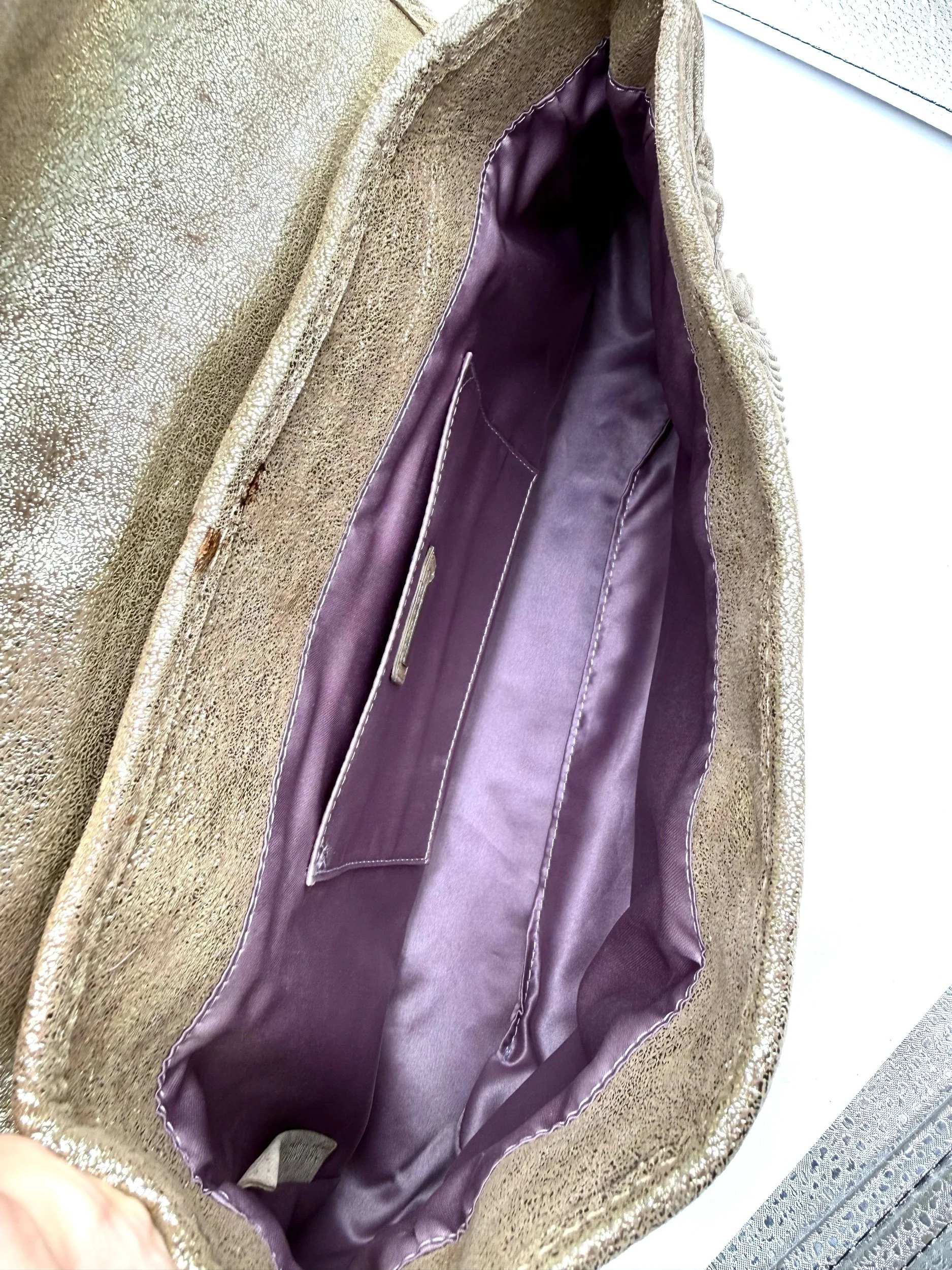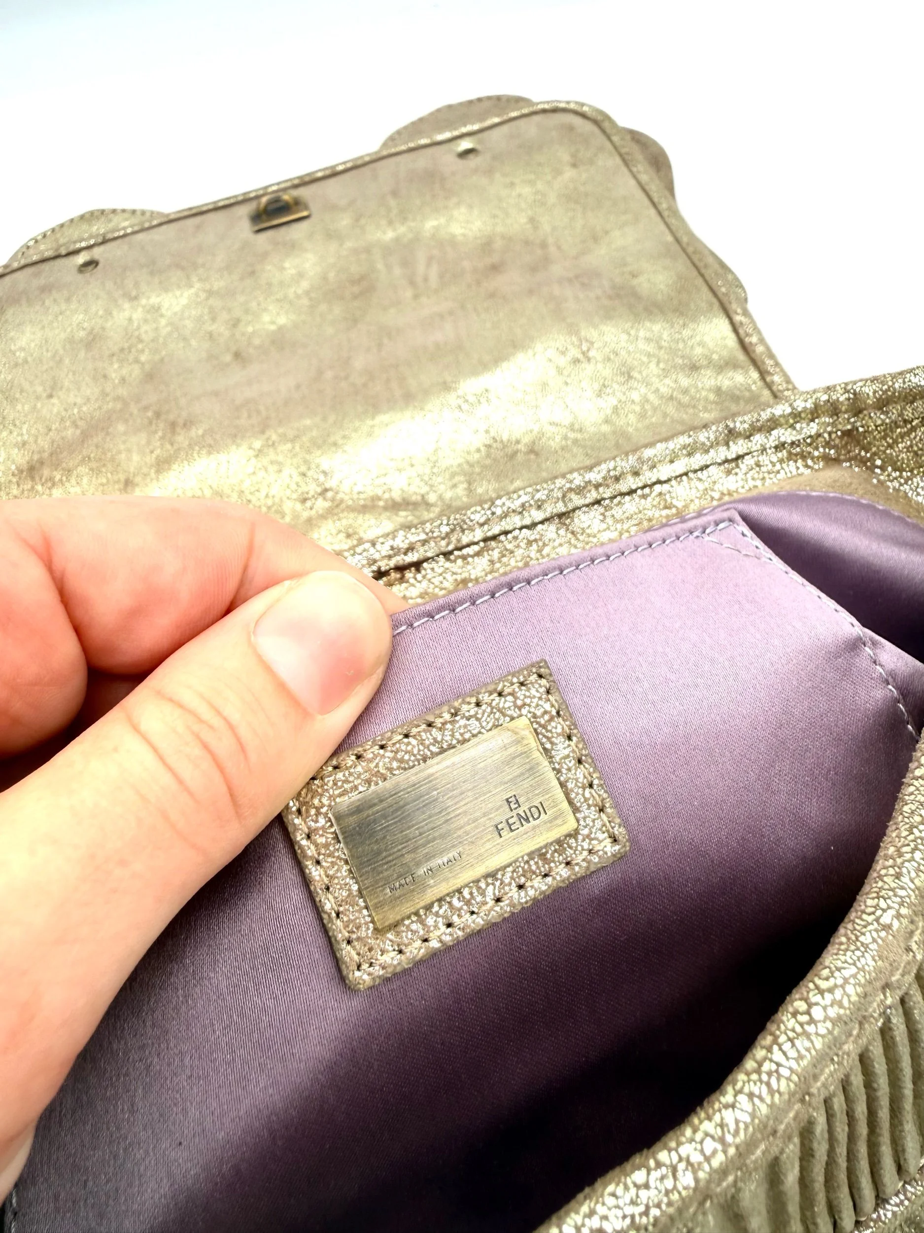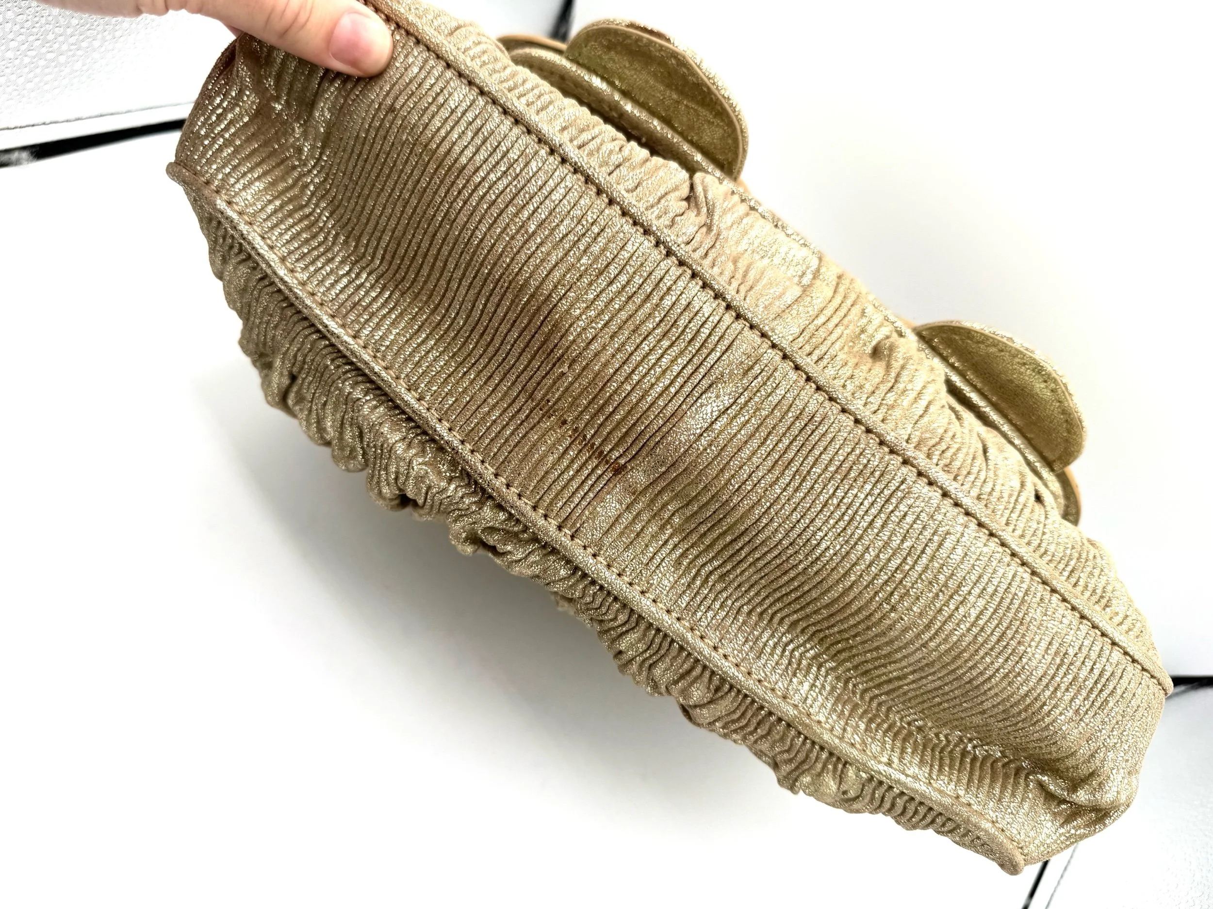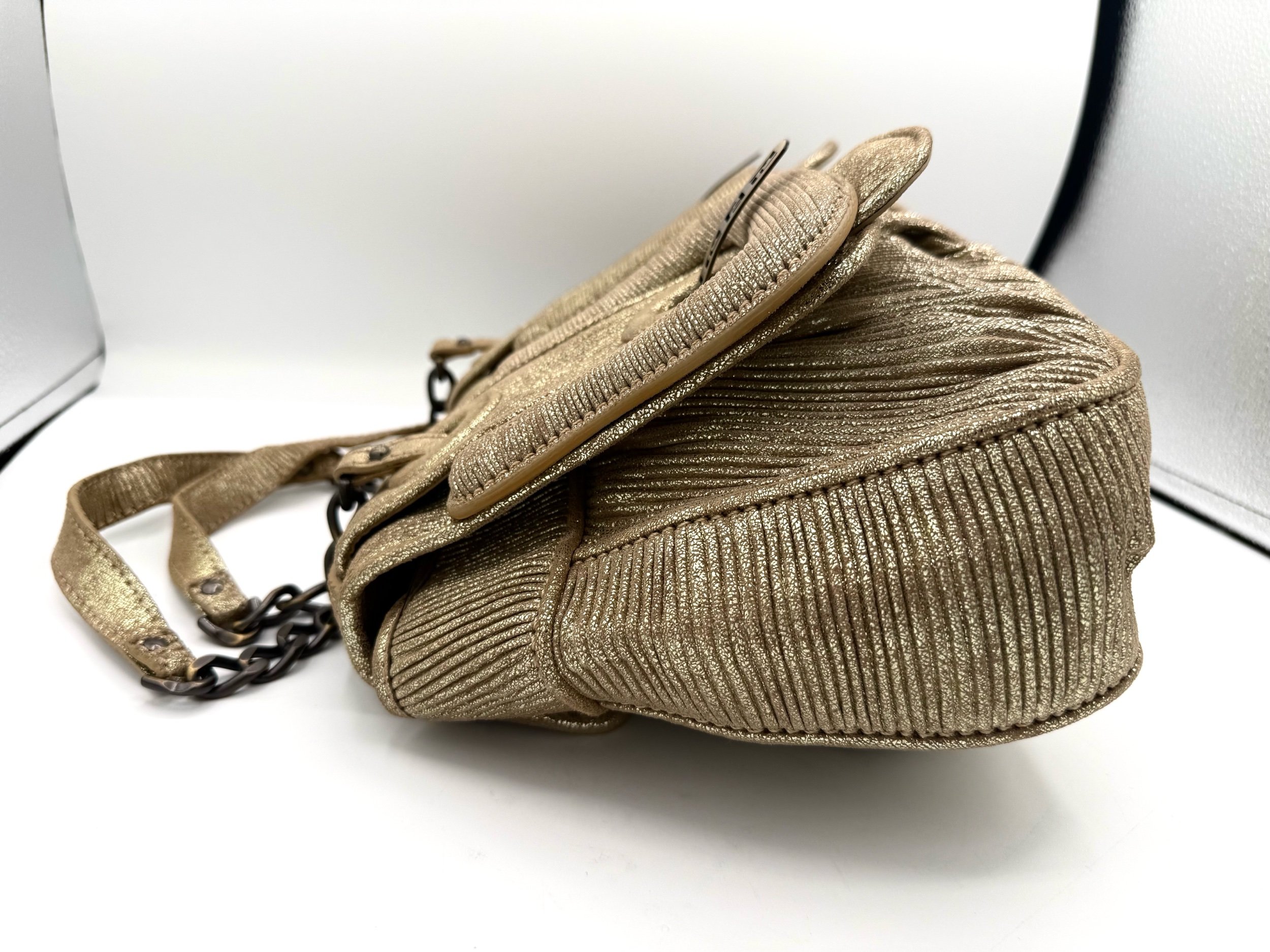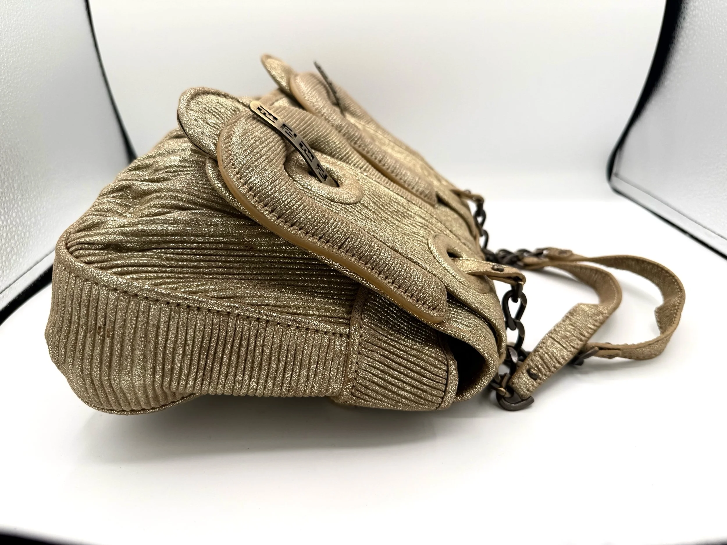 Fendi Shoulder Bag from the 2006 Collection. Crafted in metallic pleated material with gold tone hardware. Features chain link shoulder straps and front flap pockets with logo hardware detailing. Satin lined interior with card slots. Flap closure at the front.